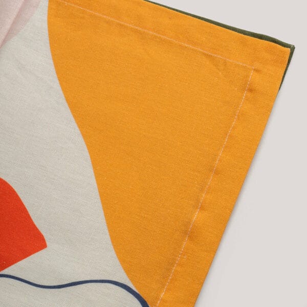 This table runner features an abstract print in yellow, green, and blue, bringing a vibrant and artistic touch to your dining space. Its lively design makes it perfect for both everyday meals and festive occasions.