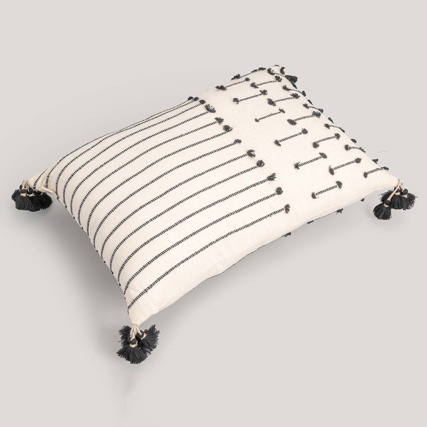 This minimal yet striking cushion features a crisp white base with bold black woven accents. The textured bands with fringed ends add a touch of handcrafted charm, making it a versatile piece that complements both modern and bohemian spaces.