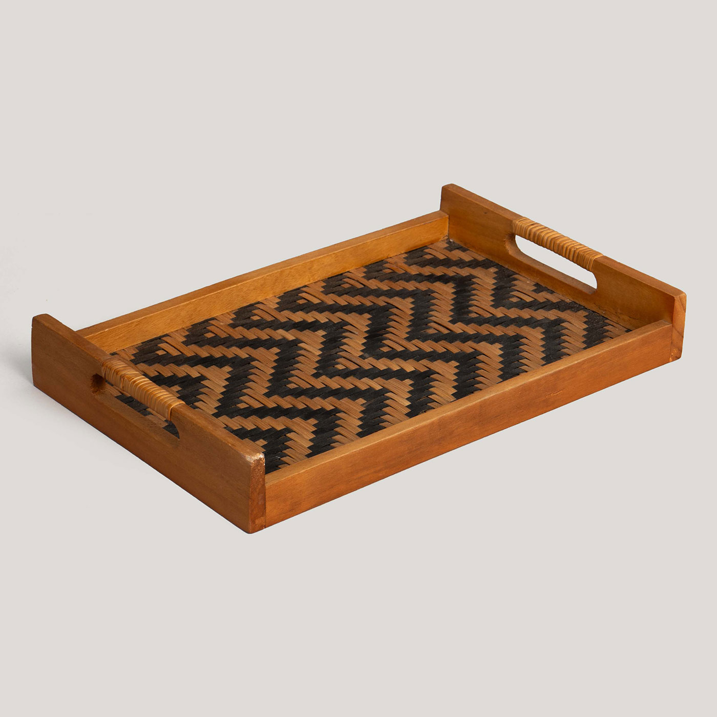 This chevron-patterned tray is handwoven from natural black and ecru fibers, creating a striking contrast with a timeless design. Perfect for serving or as a decorative piece, it brings artisanal charm and texture to any space. A blend of elegance and functionality.