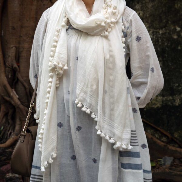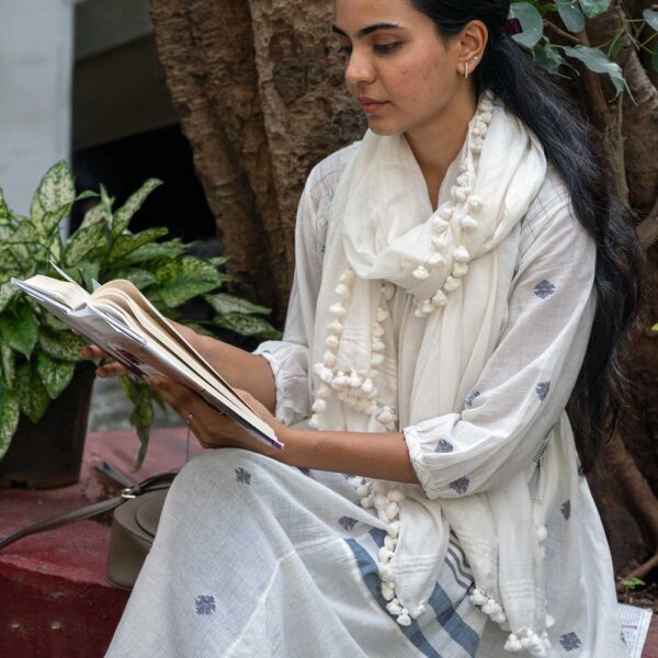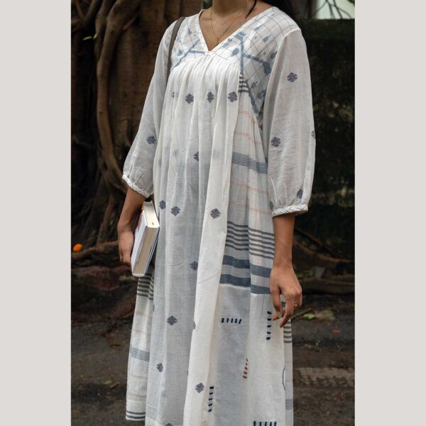 This ivory Jamdani kurti top is crafted from handwoven, handspun cotton and adorned with elegant blue motifs across the body. Its soft texture and subtle contrast bring a refined and graceful touch, making it ideal for both everyday wear and special occasions.