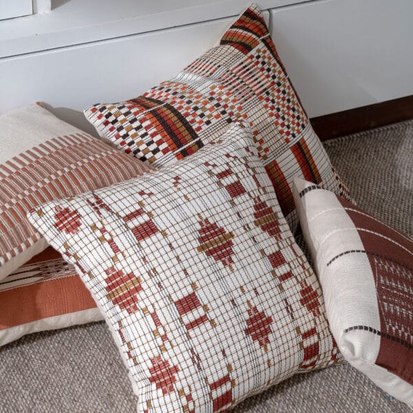This Naga cushion blends traditional weaving with a Bauhaus-inspired aesthetic, featuring checks, blocks, and dotted lines interspersed across a crisp white base. Accents of warm red, brown, and black create a bold, modern statement.