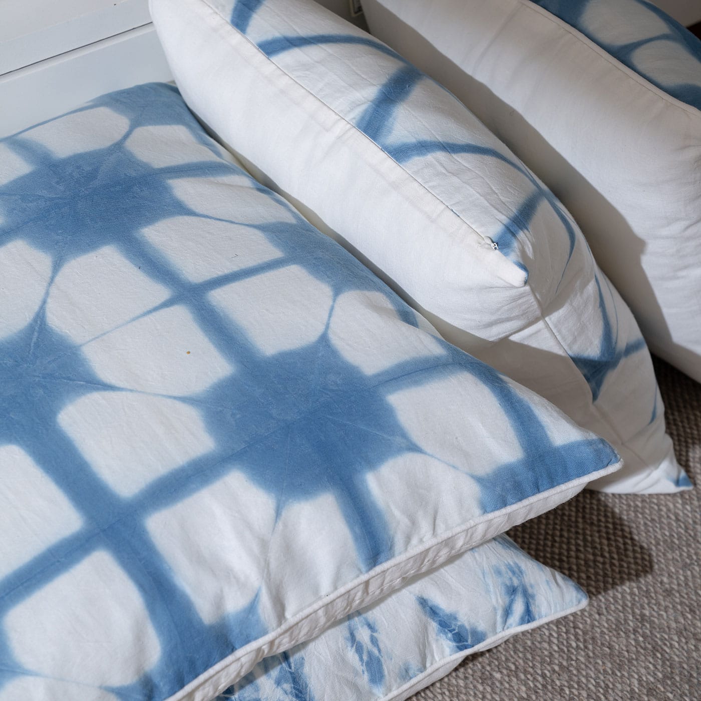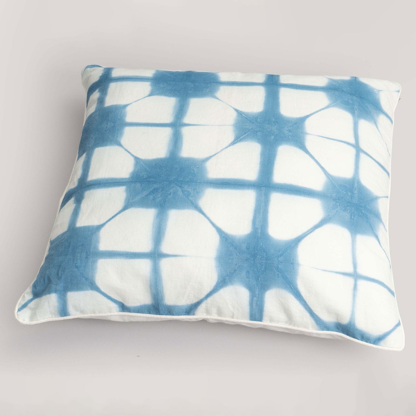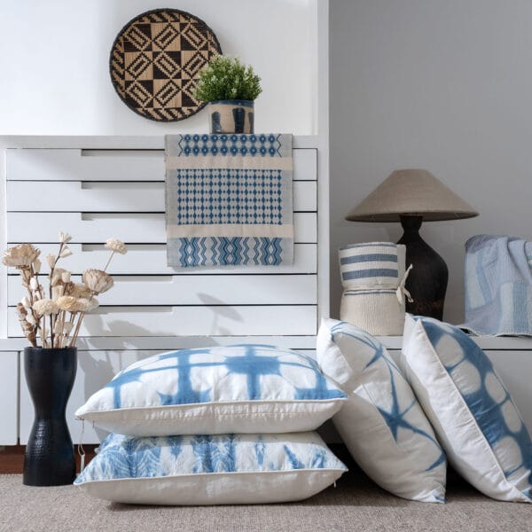 This cushion showcases a bold geometric motif in white and blue, created through traditional clamp-resist dyeing. Each piece is uniquely handcrafted, bringing modern design and artisanal charm to your sofa or bed.