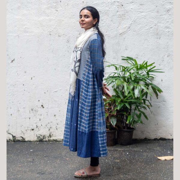This blue Jamdani kurti top is crafted from handwoven, handspun cotton and features a beautiful patchwork of different shades of blue with varied designs throughout. Its artistic detailing and rich textures create a unique, handcrafted look, perfect for both everyday wear and special occasions.