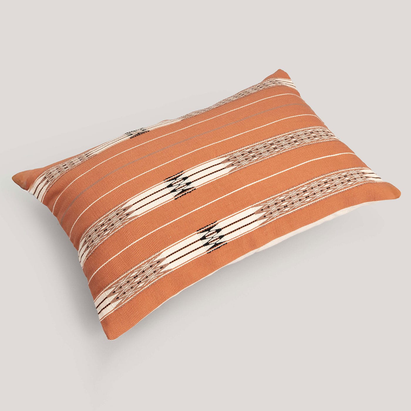 This Naga handloom cushion cover in coral, featuring a white stripes with bold traditional motifs. It adds artisanal charm and vibrance color to any space.