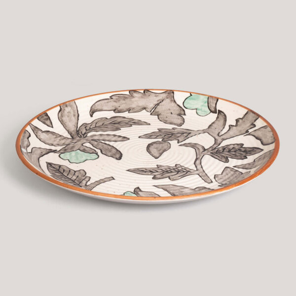 This dinner plate features soft, rounded ridges and an all-over Kalamkari-inspired leaf motif in aqua and charcoal, framed by a rust border. Artisanal detailing meets vibrant design, perfect for both everyday use and special occasions.