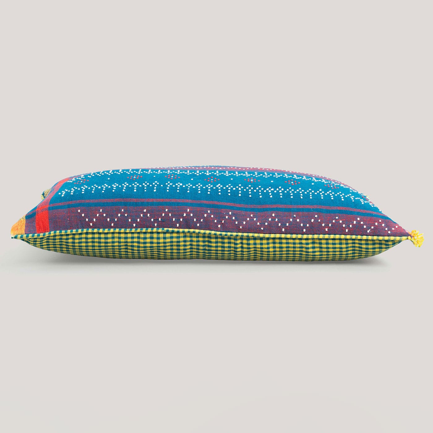 This cushion features a blue woven base with intricate dotted patterns in white and red, arranged in horizontal bands. It is accented with a multicolored border in green, yellow, and black stripes. The design adds a bold, handcrafted appeal to the cushion.