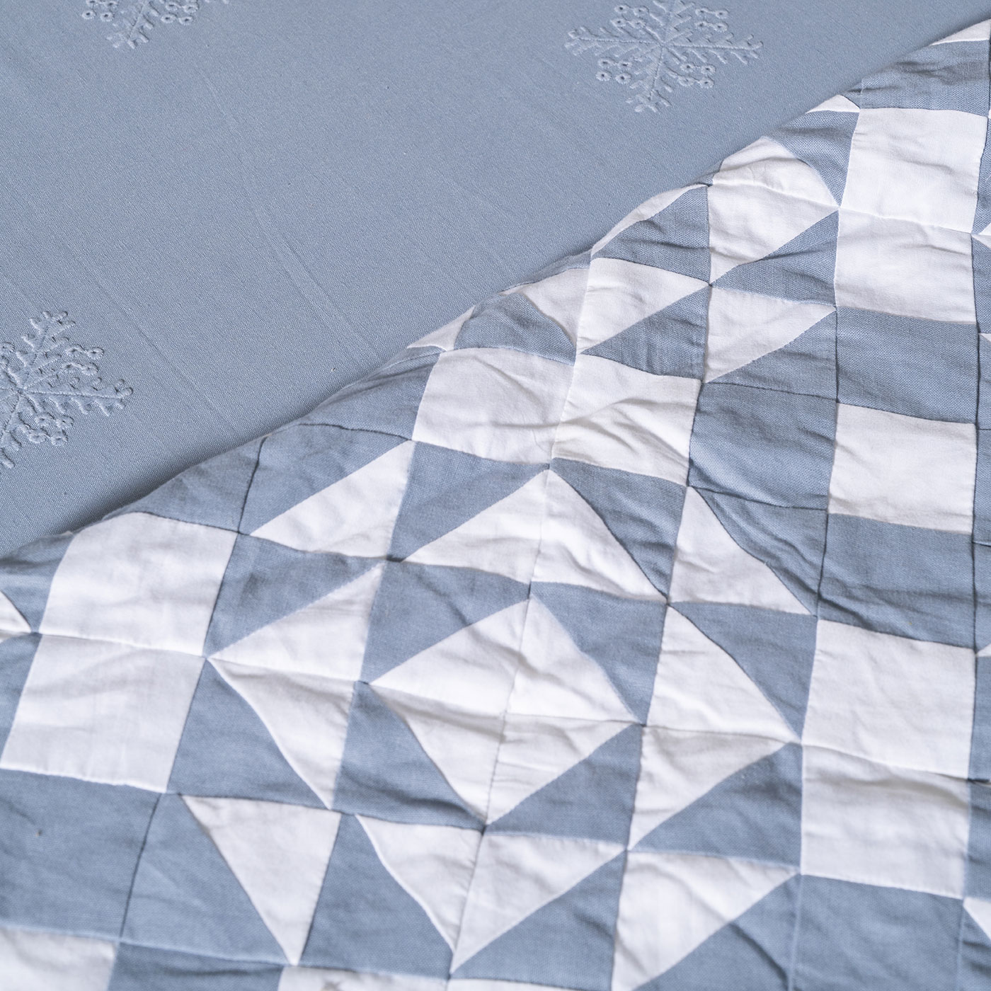 This quilt features a striking patchwork design with bold geometric star patterns in blue and white. Its crisp lines and contrasting colors create a modern yet timeless visual appeal.