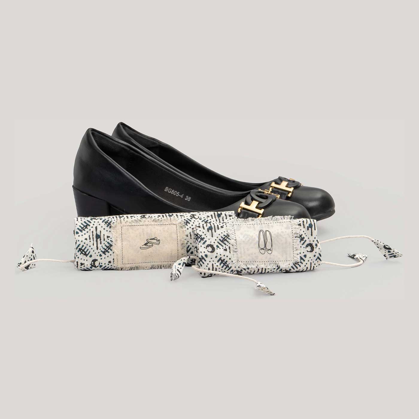 This shoe bag features a charming diamond print in indigo on an ecru base, giving it a traditional yet contemporary appeal. The drawstring closure with matching fabric tassels adds a stylish and functional touch. A frayed-edge patch with “shoe bag” stitched on it enhances its handcrafted feel.