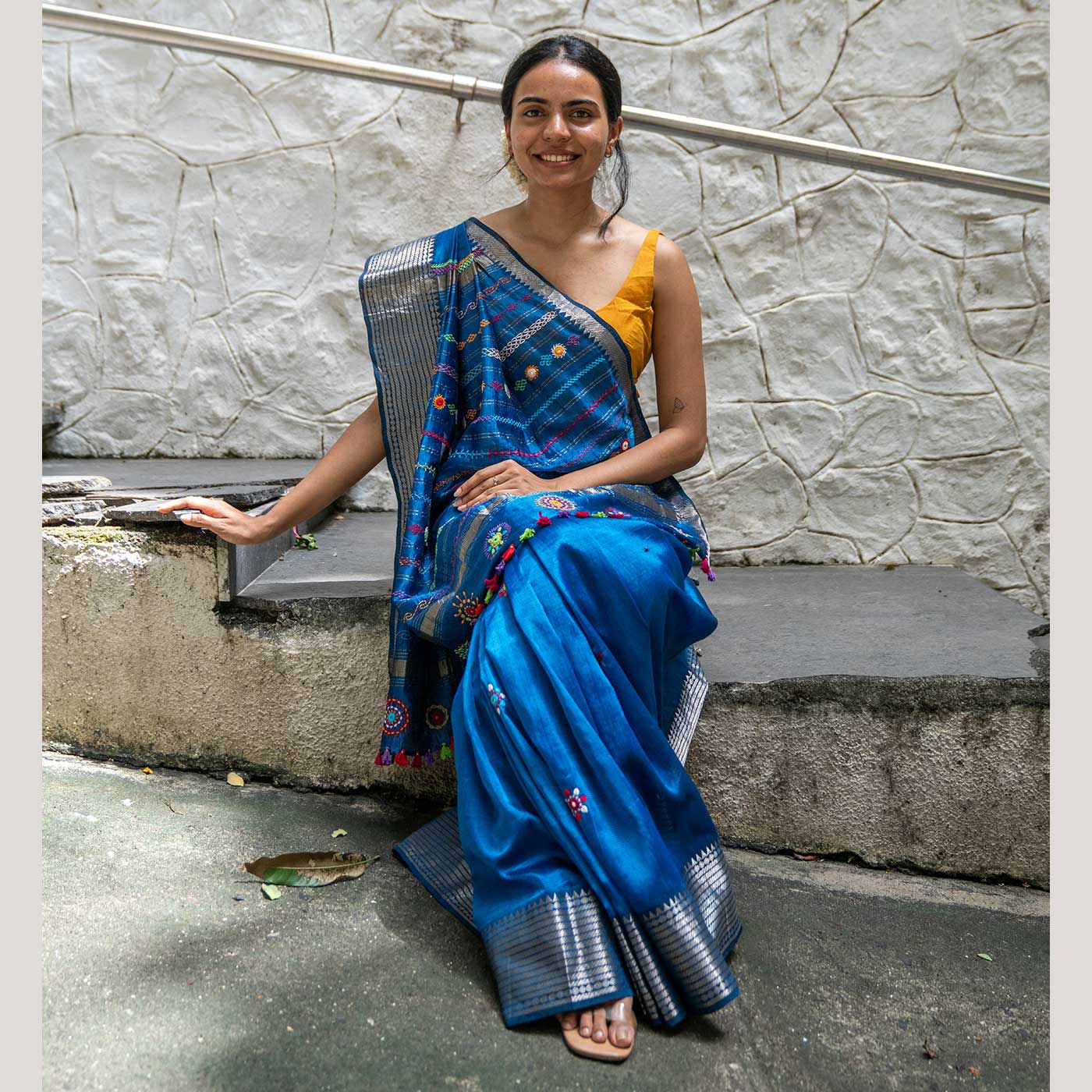 Madhavi Dark Blue Banjara Hand Embroidered Silk Cotton Saree