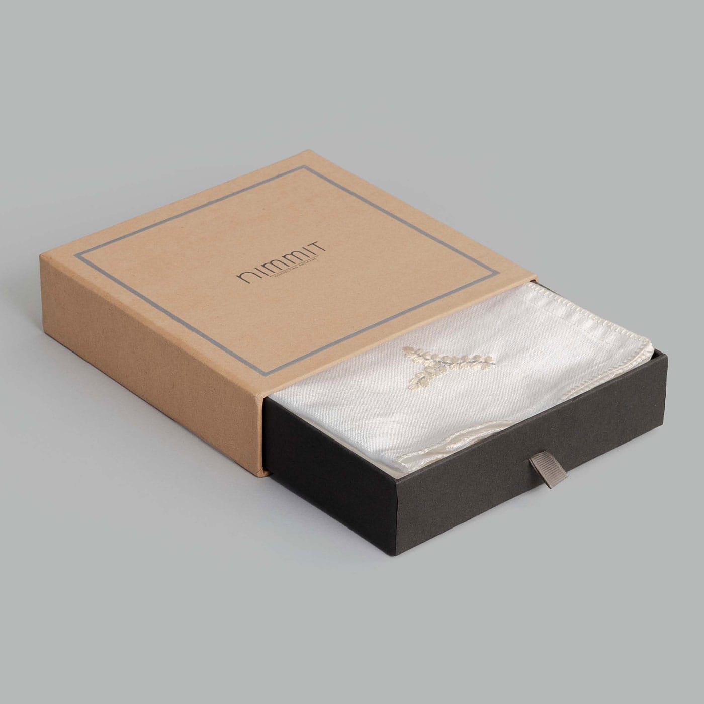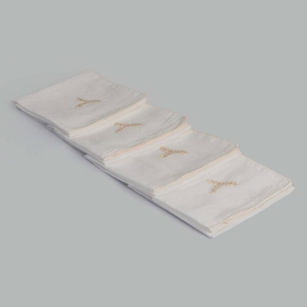 This set of napkins showcases intricate white leaf and branch embroidery with subtle silver accents, finished with a refined white blanket stitch border. Complete with four elegant napkin rings and presented in a brown gift box, it makes a sophisticated addition to any table or a thoughtful, ready-to-gift set.