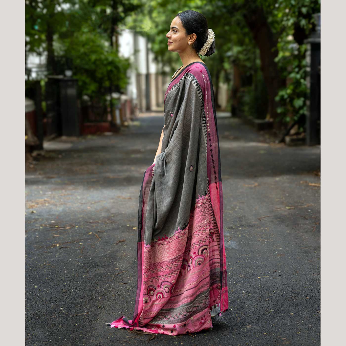 This deep grey Mangalagiri silk saree has striking fuschia borders and vibrant Banjara hand embroidery work along the pallu and borders. The saree is finished with small multicolour tassels that add a classic artisanal charm to your festivities.