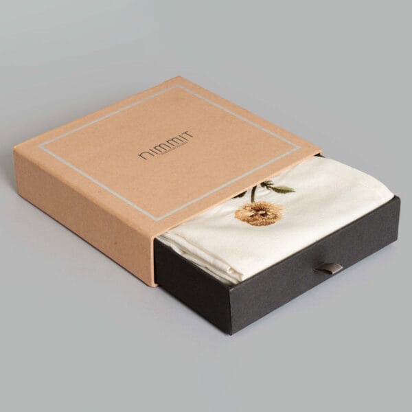 This ivory napkin features a charming floral shrub in the corner, with a sunny yellow bloom. Elegant yet inviting, it brings a fresh touch of color to any dining setting. This napkin set, presented in an elegant gift box, makes a thoughtful and timeless gift for any occasion.