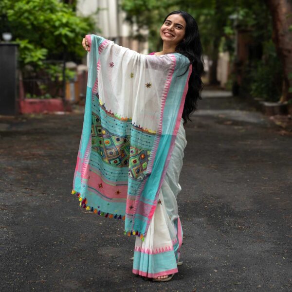 Mayavi Ivory Banjara Hand Embroidered 100% Cotton Saree - Image 4