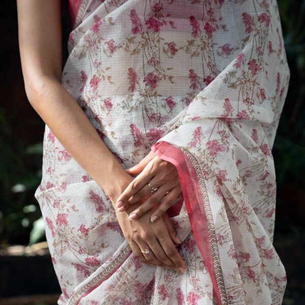This maroon saree with an white base is adorned with bold floral motifs that adds a soft, feminine charm. The look is accentuated by a bold maroon border, that enhances its traditional appeal. Light and graceful, it’s ideal for festive occasions and cultural celebrations.