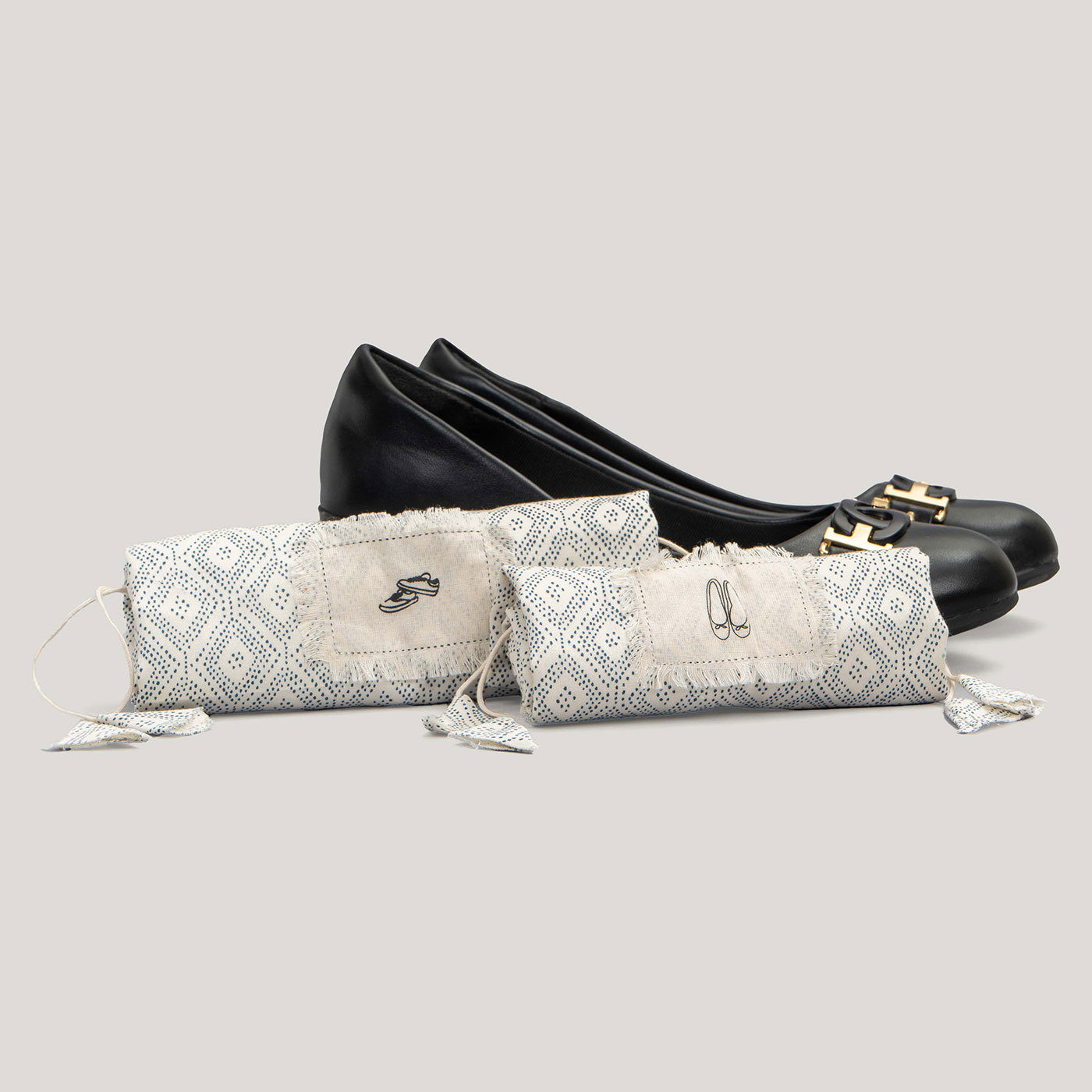 This shoe bag features a charming hand-block-inspired geometric print in deep indigo on a cream base, giving it a traditional yet contemporary appeal. The drawstring closure with matching fabric tassels adds a stylish and functional touch. A frayed-edge patch with “shoe bag” stitched on it enhances its handcrafted feel.