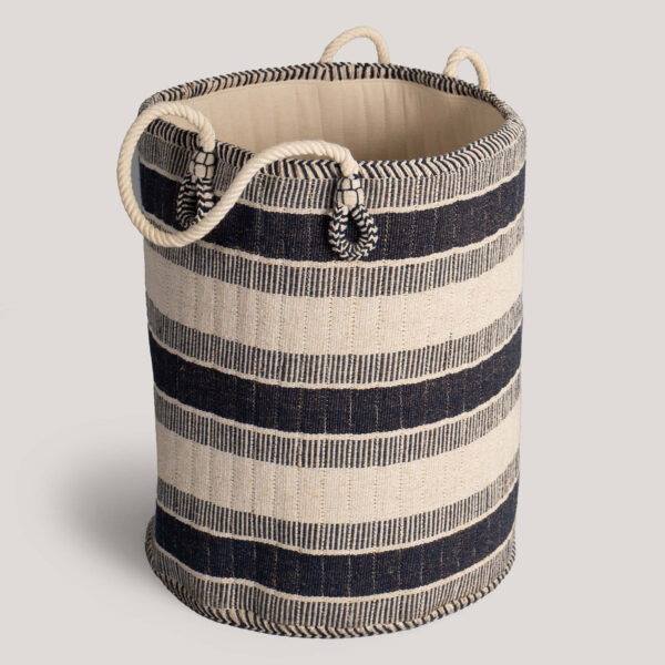 This handcrafted basket features broad black-and-white stripes with braided detailing at the rim. Its simple, classic look makes it versatile for home organization.