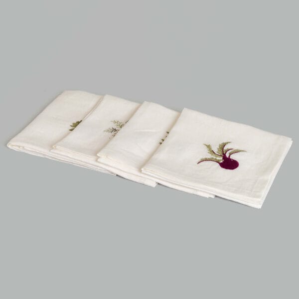 This set of four napkins features assorted vegetable motifs, delicately embroidered in multicolour on each corner. Playful yet elegant, they bring natural charm to any table—and come boxed, ready to gift.