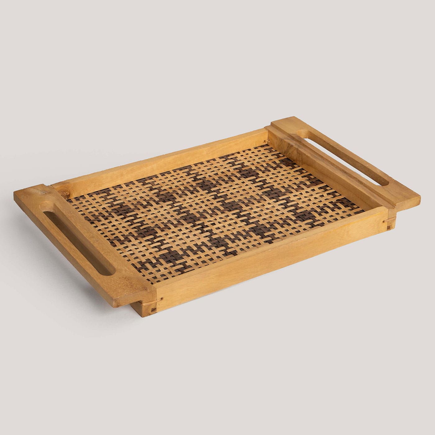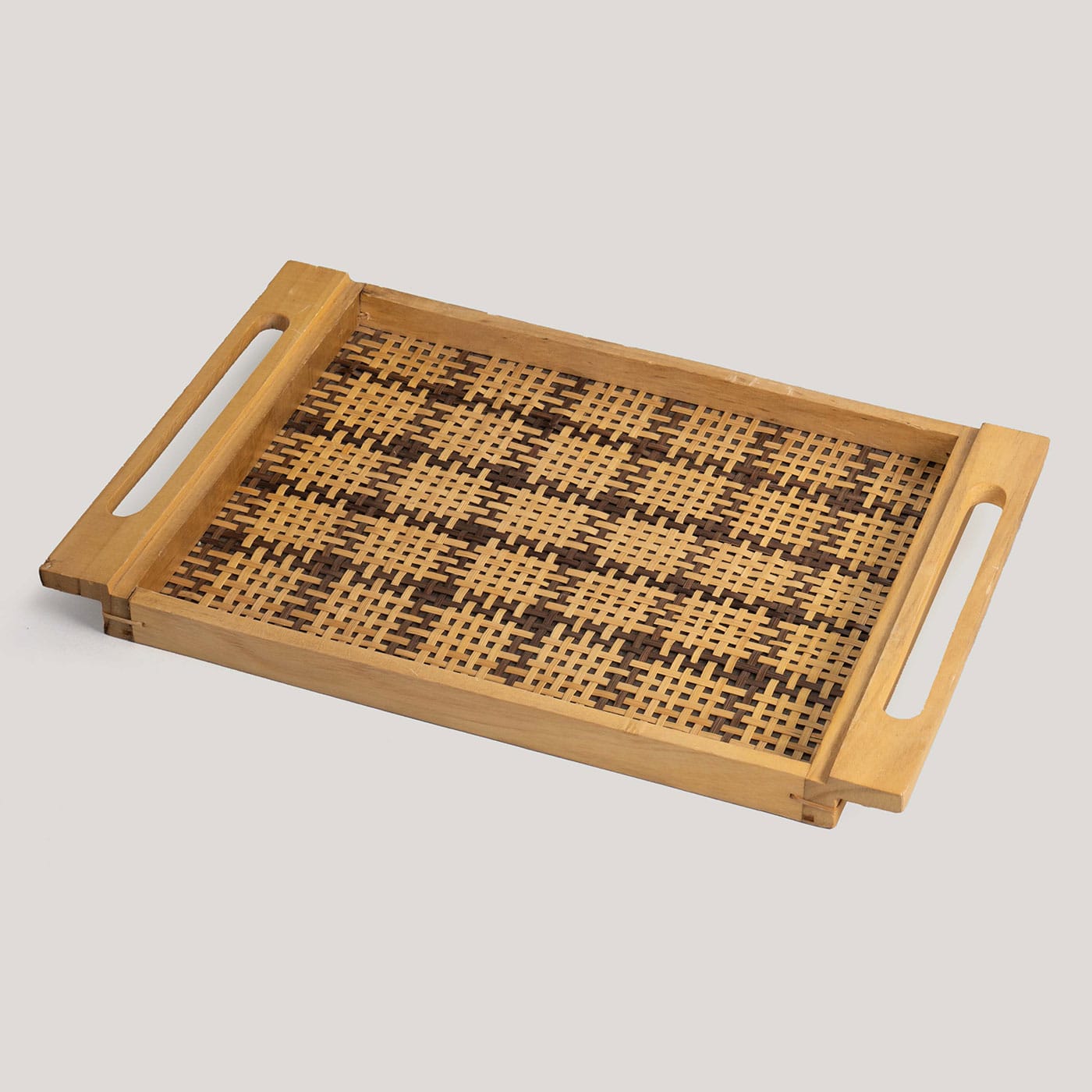 This rectangular tray features a checked pattern, handwoven from natural black and ecru fibers. Its clean lines and contrasting tones add a modern, textured touch to your serving essentials or decor. Stylish and practical for everyday use.