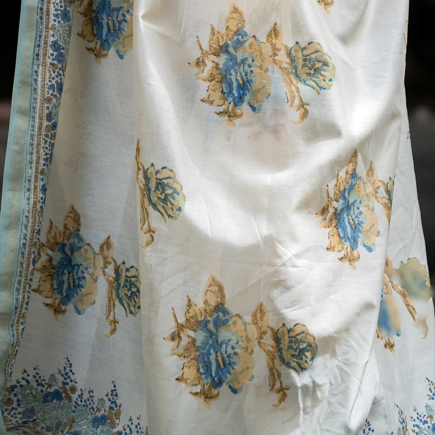This vibrant silk saree showcases bold block-printed roses at the center, creating a striking focal point. It is framed with a unique double border—an eye-catching grey outer border paired with a delicate blue floral inner border. The combination of rich colors and handcrafted detailing makes it perfect for festive and celebratory occasions.