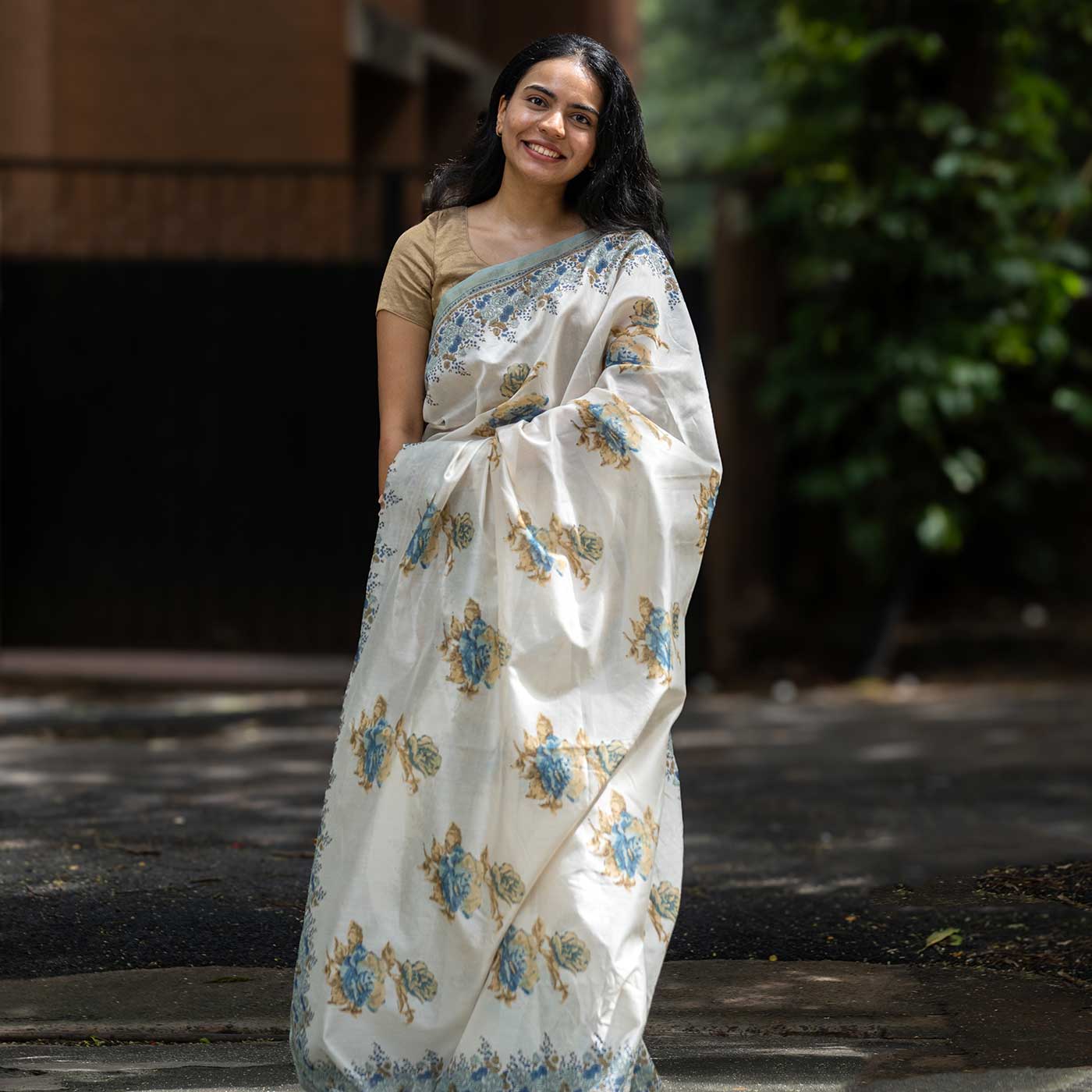 Ridhi Blue Hand Block Printed Cotton Silk Saree