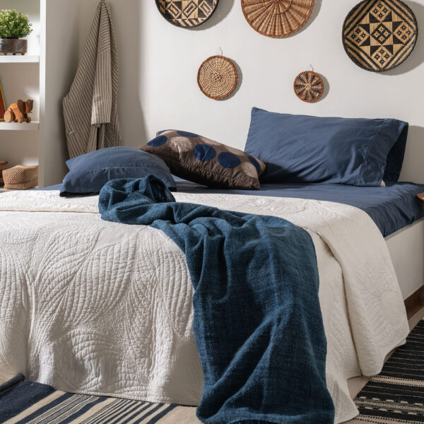This plain indigo handspun wool throw features a beautifully textured surface, accented by long twisted tassels on two sides. Naturally soft and warm, it’s a versatile layer of artisanal luxury for your home.