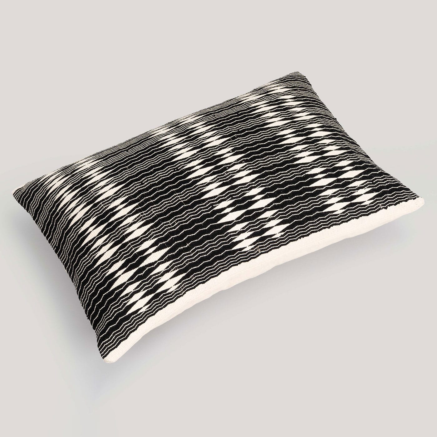 This black lumbar cushion is crafted with Naga handloom weave with diamond motifs intricately arranged to form a textured appearance. Handcrafted and versatile, it adds depth and artisanal charm to sofas or beds.