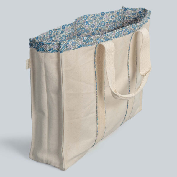 This simple off-white canvas tote is elevated with a delicate blue floral trim at the top. Its neutral base and subtle accent make it a versatile everyday bag, perfect for casual outings or light errands.